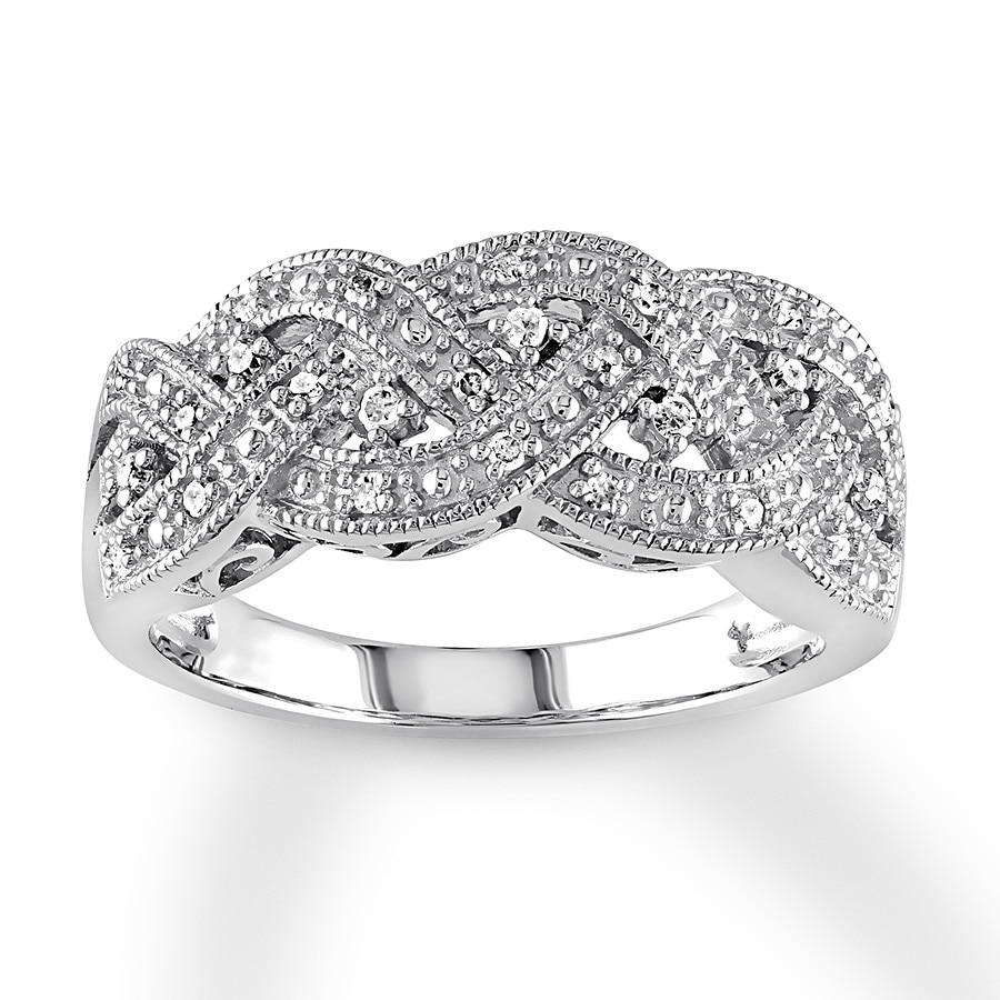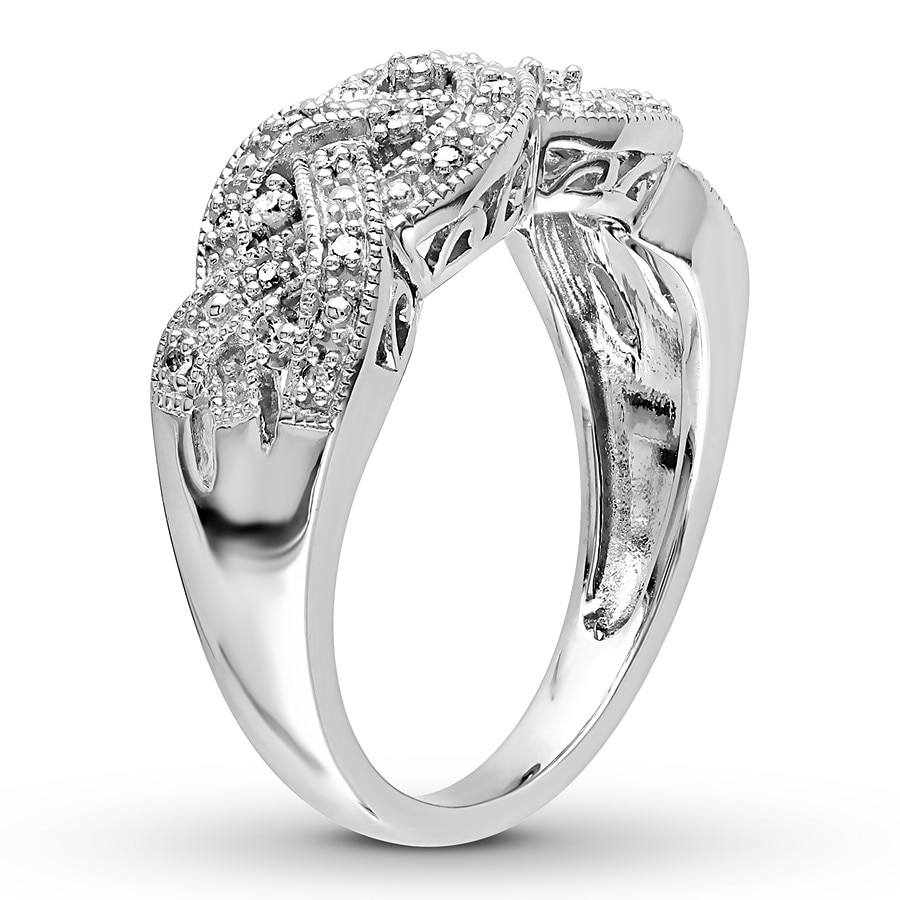 Overlapping ribbons of round diamonds create a sparkling woven design in this beautiful ring for her. Styled in sterling silver, the ring has a total diamond weight of 1/8 carat.