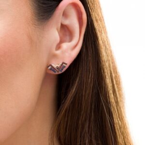 With stunning color, these distinctive gemstone stud earringsdeliver valiant design. Fashioned in sterling silver and warm 10K gold, each dynamic earring showcases the logo in eye-catching silver rows of regal red garnets and bright blue sapphires. A sculpted ribbon in polished yellow gold completes this classic symbol. Buffed to a brilliant luster, these post earrings secure comfortably with friction backs. This exclusive fine jewelry collection inspires you to wear your strength, confidence and power.